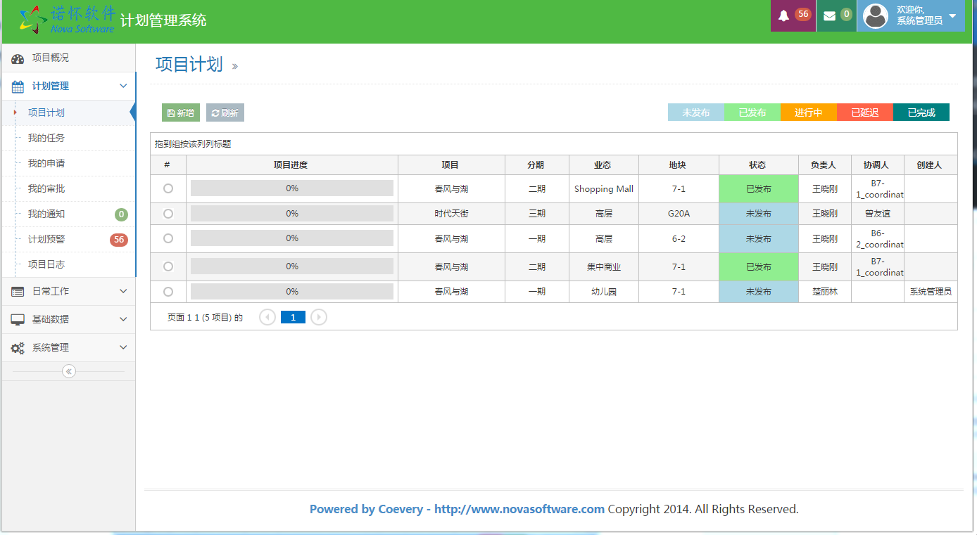 諾懷項(xiàng)目計(jì)劃管理系統(tǒng)適用于各類 以項(xiàng)目形式驅(qū)動(dòng)的產(chǎn)業(yè)線,覆蓋房地產(chǎn)、建筑、廣告、制造等諸多行業(yè),涉及項(xiàng)目追蹤、目標(biāo)跟進(jìn)、人員協(xié)調(diào)、生產(chǎn)資料管理、變更審批、人力成本統(tǒng)計(jì)、收入統(tǒng)計(jì)、檔案管理等方面。