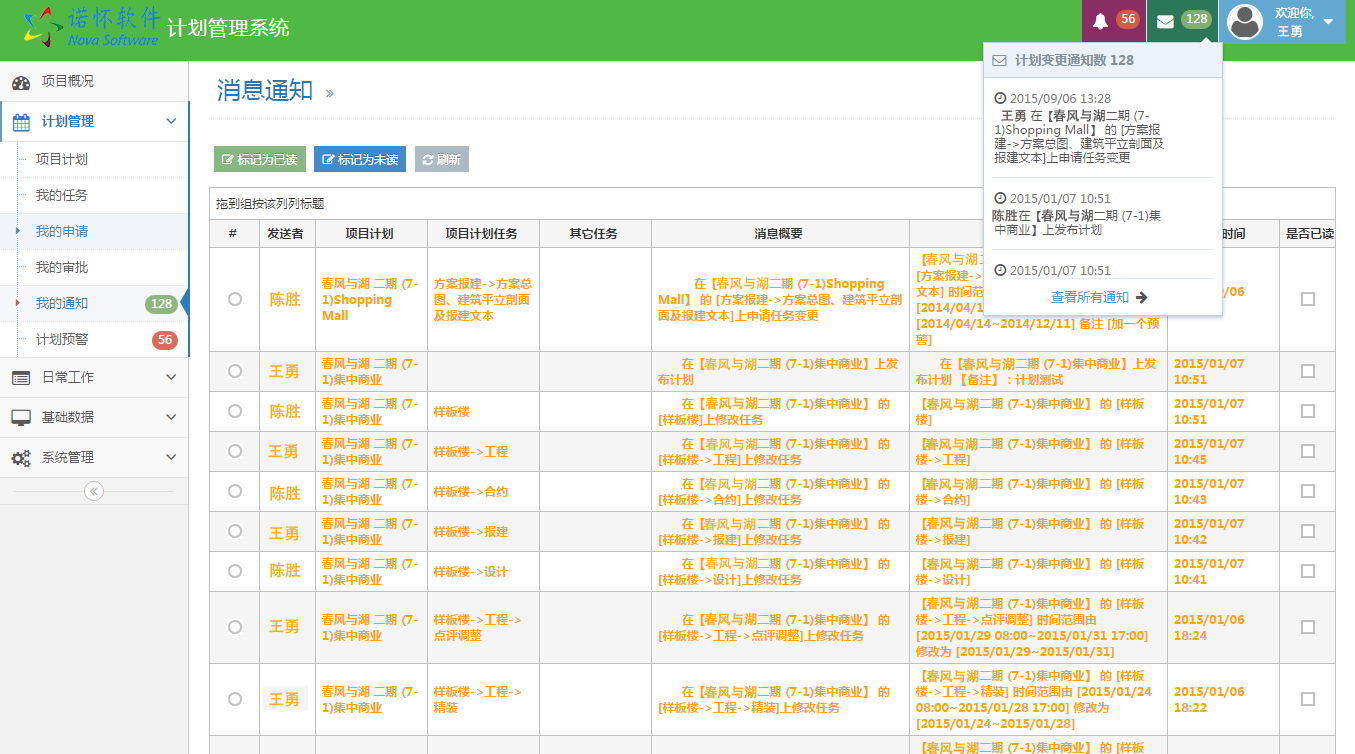系統(tǒng)可以維護(hù)幾種類型的項(xiàng)目計(jì)劃,主項(xiàng)計(jì)劃,專項(xiàng)計(jì)劃,臨時(shí)計(jì)劃;主項(xiàng)計(jì)劃是從獲取土地到樓盤(pán)售罄的一寫(xiě)列貫穿項(xiàng)目始終的項(xiàng)目計(jì)劃,計(jì)劃保持相對(duì)較粗的粒度;專項(xiàng)計(jì)劃是主項(xiàng)計(jì)劃的細(xì)分計(jì)劃;臨時(shí)計(jì)劃是個(gè)人或業(yè)務(wù)部門(mén)制定的一些臨時(shí)計(jì)劃,這些計(jì)劃的制定可以確保主項(xiàng)計(jì)劃的順利推進(jìn)。